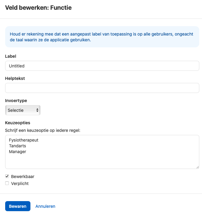 Elk profielveld kan worden aangepast. Je hebt de mogelijkheid om:
